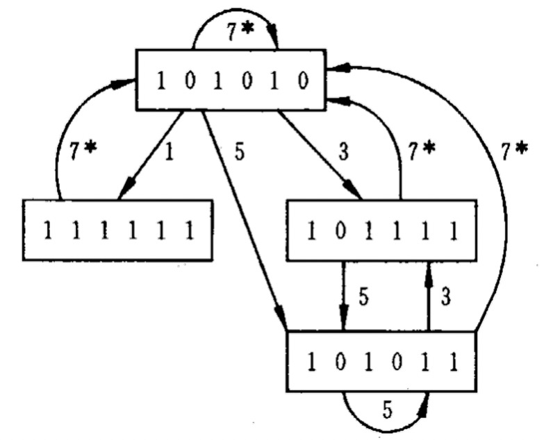 状态图:将冲突向量 作为初始冲突向量送入一个 位逻辑右移移位器,移位 次,移出 则与初始向量作按位或运算![图 3.1 调度流水线的状态图]()