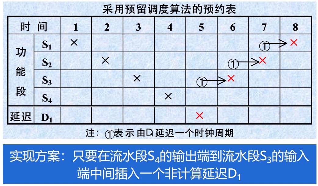预约表:横向(向右)是时间(一般用时钟周期表示),纵向(向下)是流水线的段。如果在第 个时钟周期使用第 段,则在第 行和第 列的交叉处的格子里有一个 ×