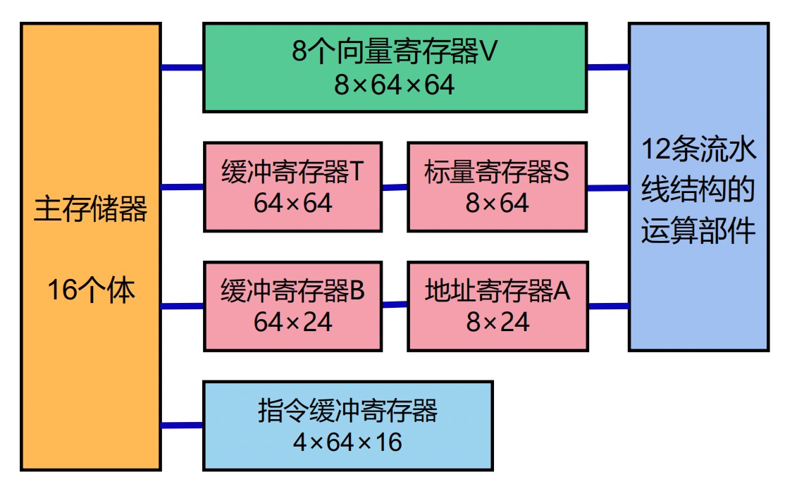 S/A 寄存器快于 T/B 寄存器,没有一个流水功能部件直接与主存相连;每个向量寄存器 Vi 都有连到 6 个向量功能部件的单独总线