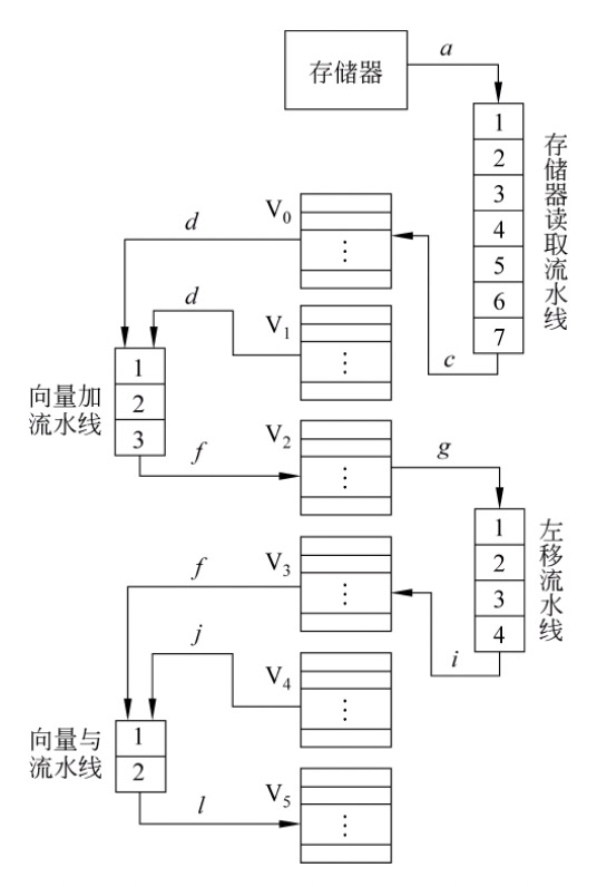 其中,把向量数据元素送往向量功能部件以及把结果存入向量寄存器都需要一拍时间 (c, d, f, g, i, j, l),从存储器中把数据送入访存功能部件也需要一拍时间 (a),通过时间 + 完成时间