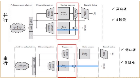 如果 Cache 访问时间要求严格(按序处理器),则需要使用并行访问;否则(乱序处理器通过乱序执行指令弥补运行上的延迟)可以串行